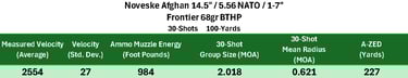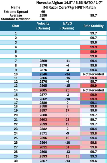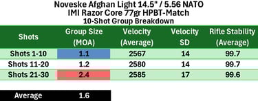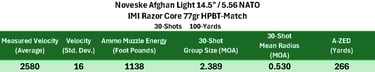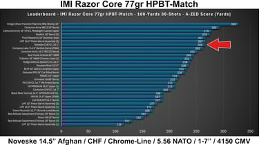 Performance was fairly solid overall, with the barrel showing its strongest results with IMI Razor Core 77gr HPBT-Match, which delivered the highest A-ZED.