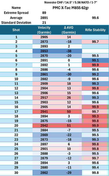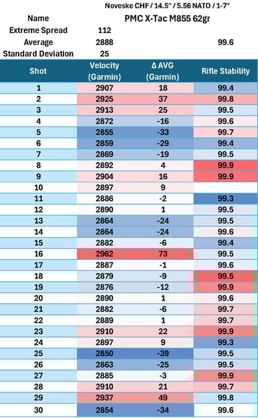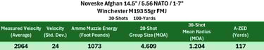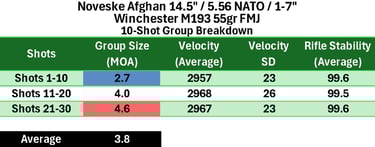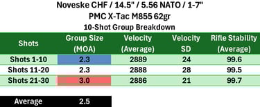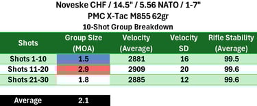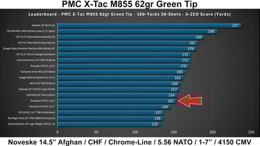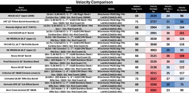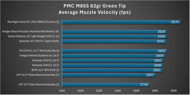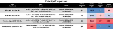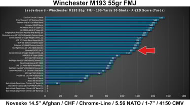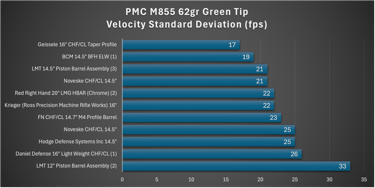 M193 lagged significantly behind (per usual), while M855 showed moderate performance with fairly consistent performance between groups. Overall, this barrel falls into the mid-to-upper tier for a chrome-lined, CHF, duty-oriented barrel, but does not clearly separate itself from strong competitors.